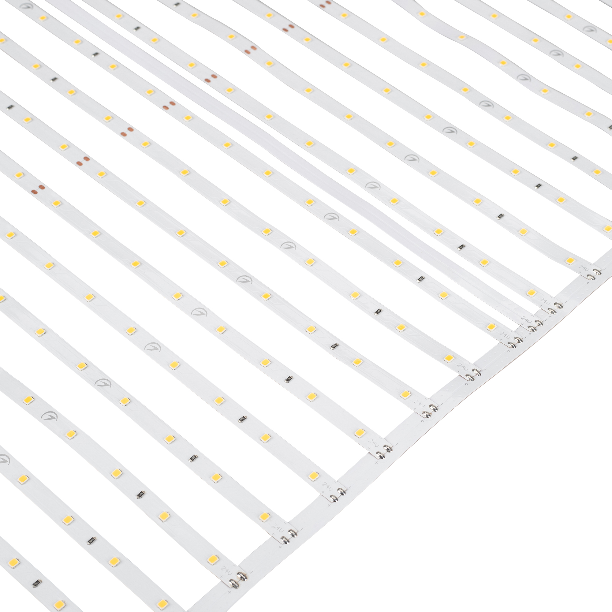 Светодиодная лента-сеть из шести сегментов по 20 линий, соединенных между собой платой-проводником длиной 500 мм, расстояние между центрами соседних линий 25мм, общая длина сети 3000 мм, светодиоды smd 2835, 640 шт/м (1920шт на 3м), белая плата 8мм, скотч 3М. Цвет ТЕПЛЫЙ 2700-3200K Напряжение питания 24В, мощность 43,6 Вт/м (130,8 Вт на 3м), угол 120° CRI>85 Световая эффективность 150 лм/Вт. Шаг резки 500 мм. Размеры сегмента 500х410х1,2 мм. (320 светодиодов) Размер ленты-сети 3000х410х1,2 мм. Дополнительный теплоотвод не обязателен.